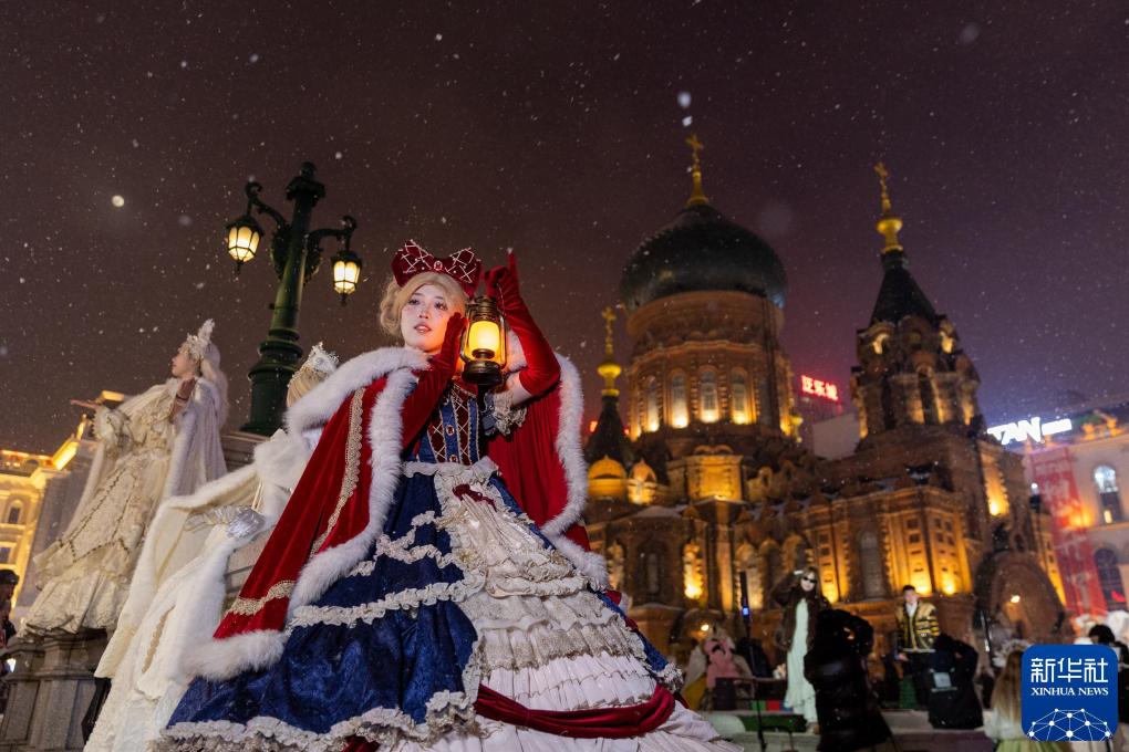 2025年1月13日,在哈尔滨建筑艺术广场,游客在雪中拍摄照片。新华社记者 张涛 摄