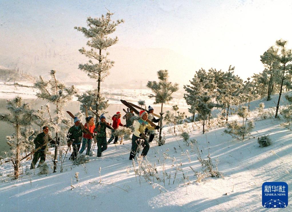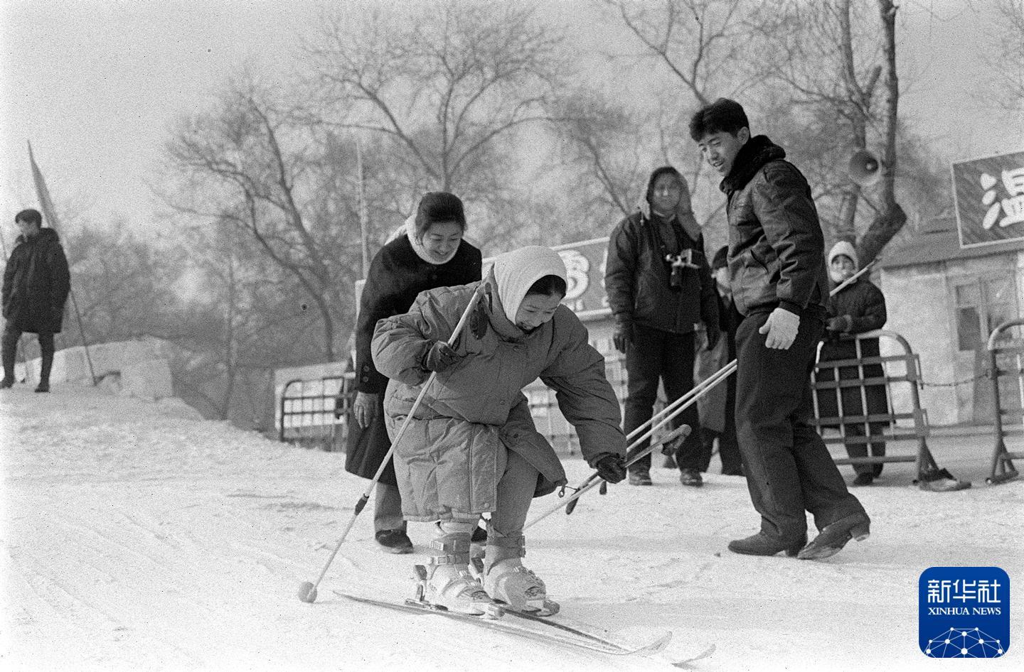 1979年寒假期间,吉林市的少年滑雪爱好者来到北山公园雪场上练习滑雪。新华社记者 刘恩泰 摄