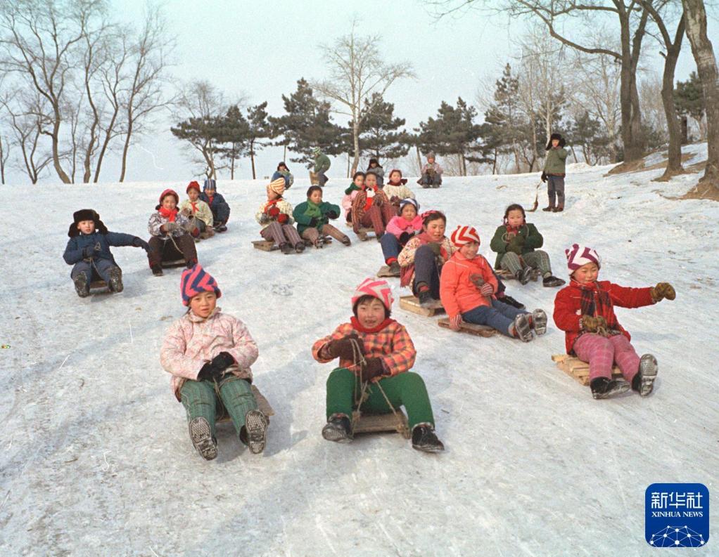 1979年,吉林市的小学生乘坐冰爬犁在雪坡上由高处往下溜。新华社记者 刘恩泰 摄