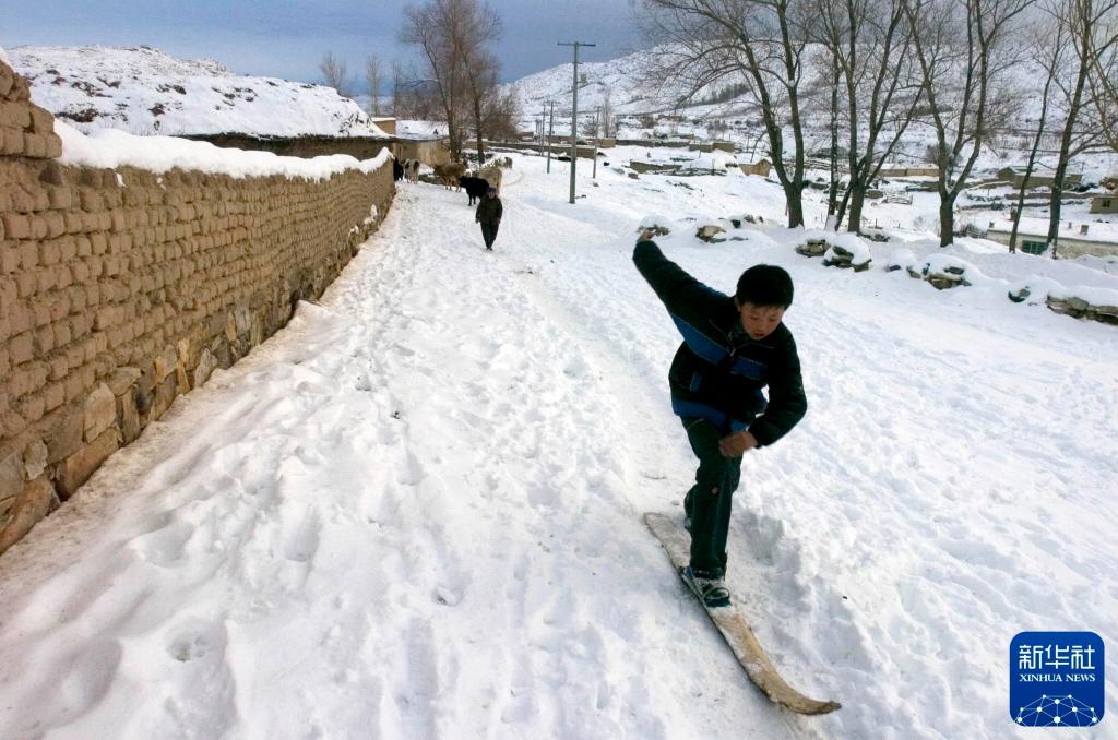 2005年11月6日,新疆阿勒泰市汗德尕特乡,一名小朋友在玩雪板。新华社发