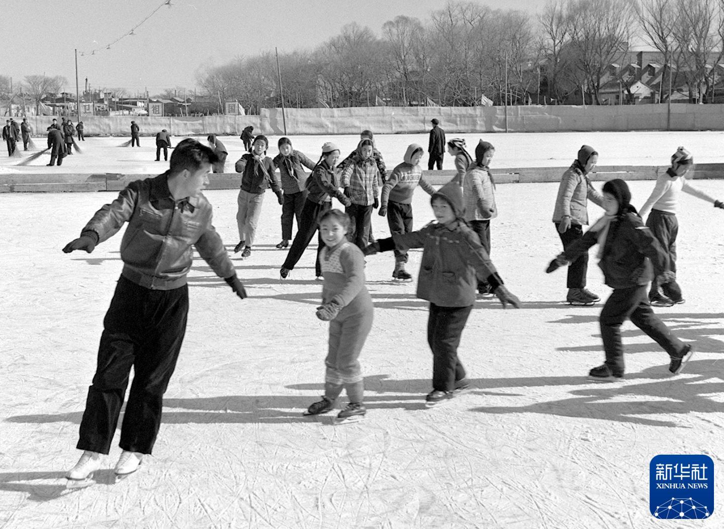 1963年,在北京什刹海,花样滑冰训练班的孩子们在教练指导下练习滑冰。新华社记者 黄景达 摄
