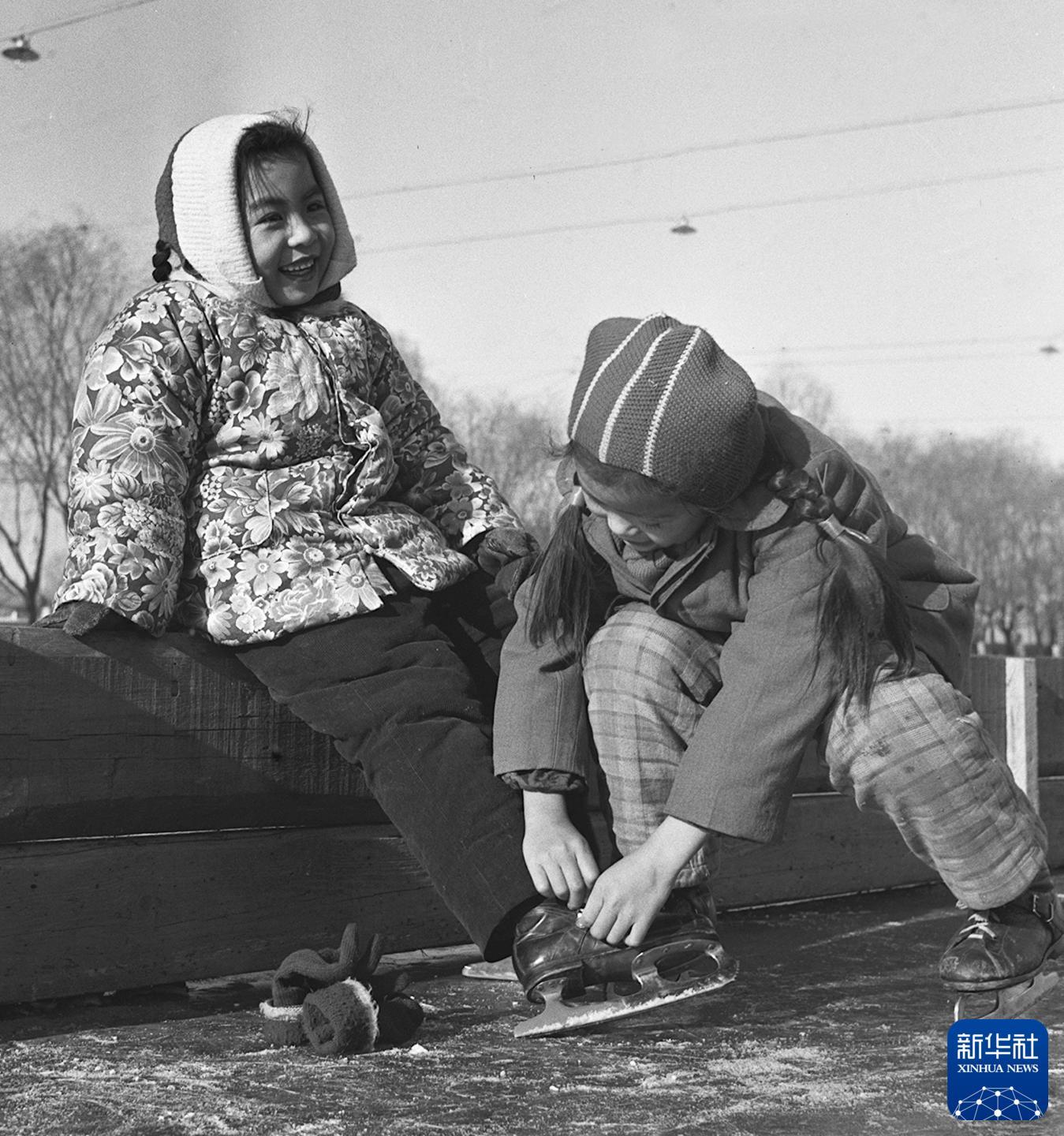 1959年拍摄的北京什刹海冰场上两个小滑冰爱好者。新华社记者 谢琍 摄