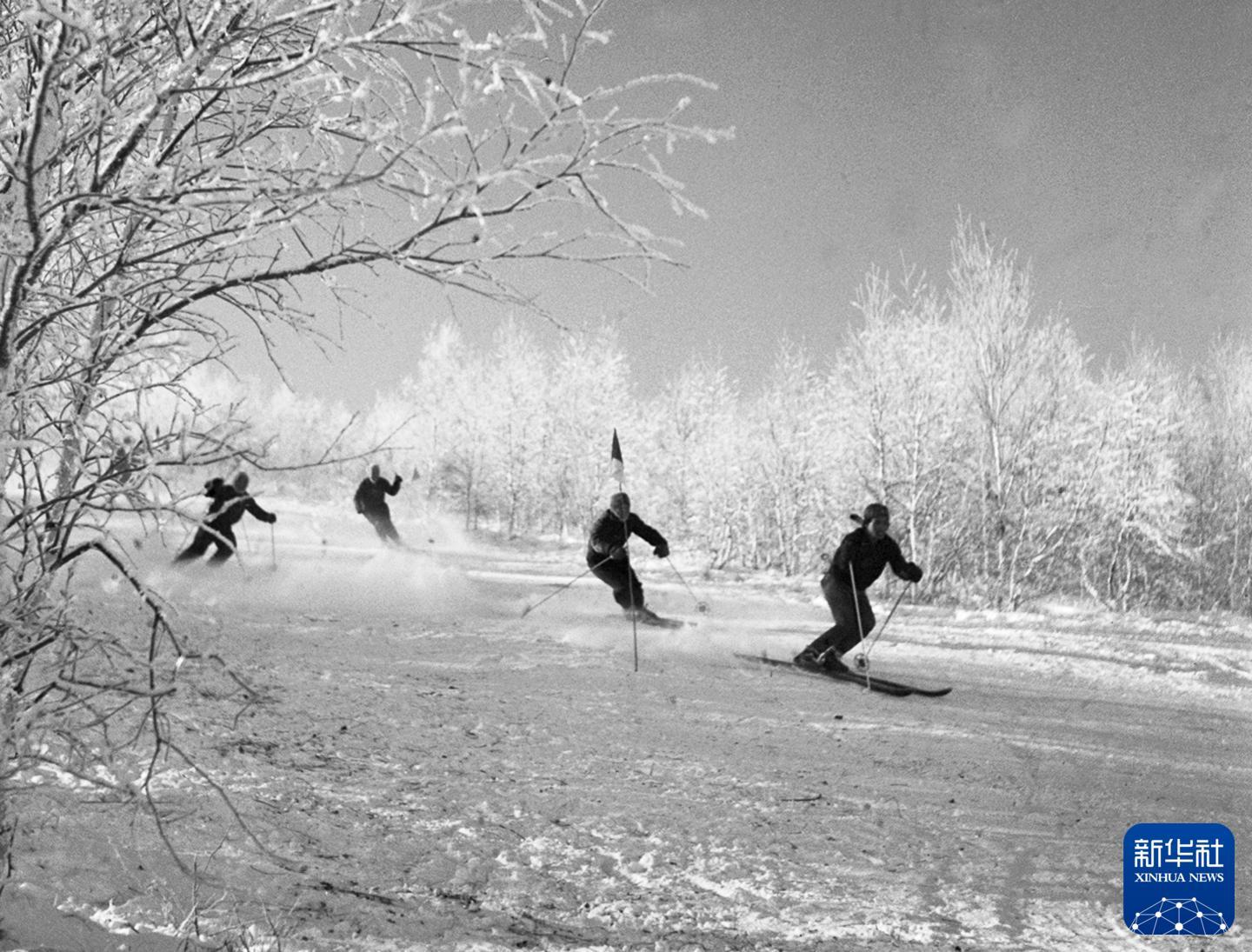1963年,在内蒙古大兴安岭阿尔山林区,滑雪运动员正在练习大回转滑行技术。 新华社记者 赵连升 摄
