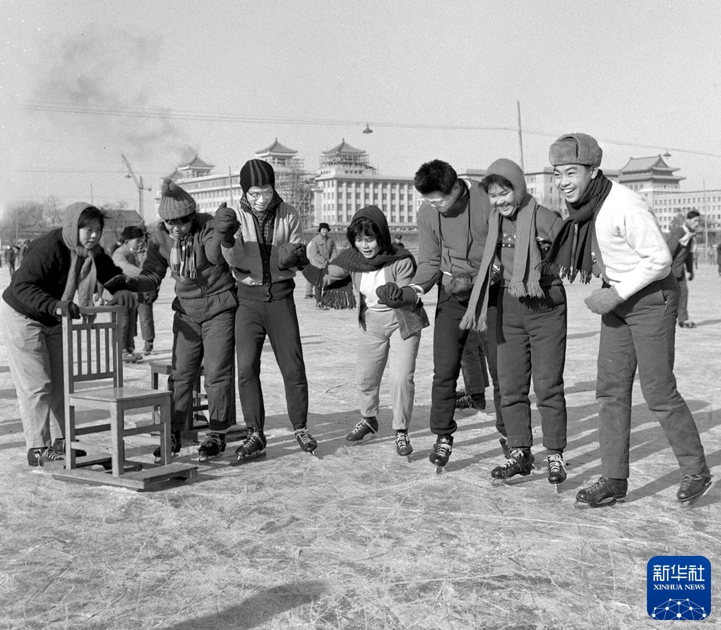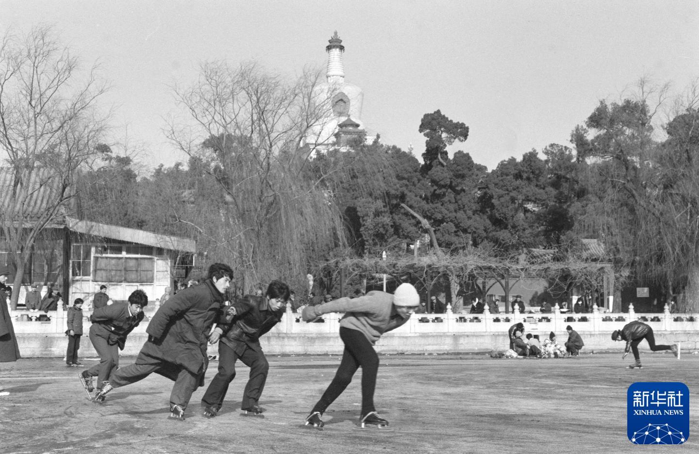 1984年,滑冰爱好者在北海公园滑冰场上练习速滑。新华社记者 黄景达 摄