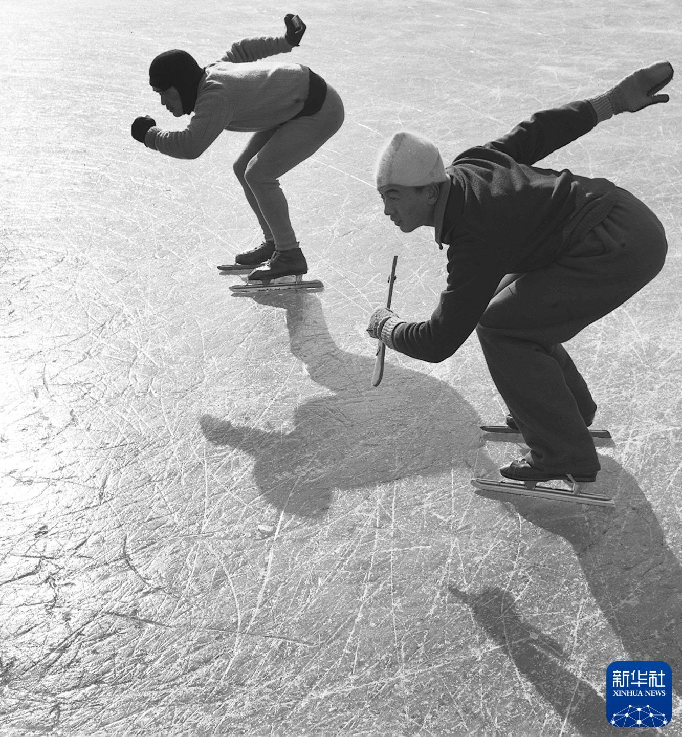 1959年,在北京什刹海冰场上练习速滑起跑的两个滑冰爱好者。新华社记者 黄景达 摄