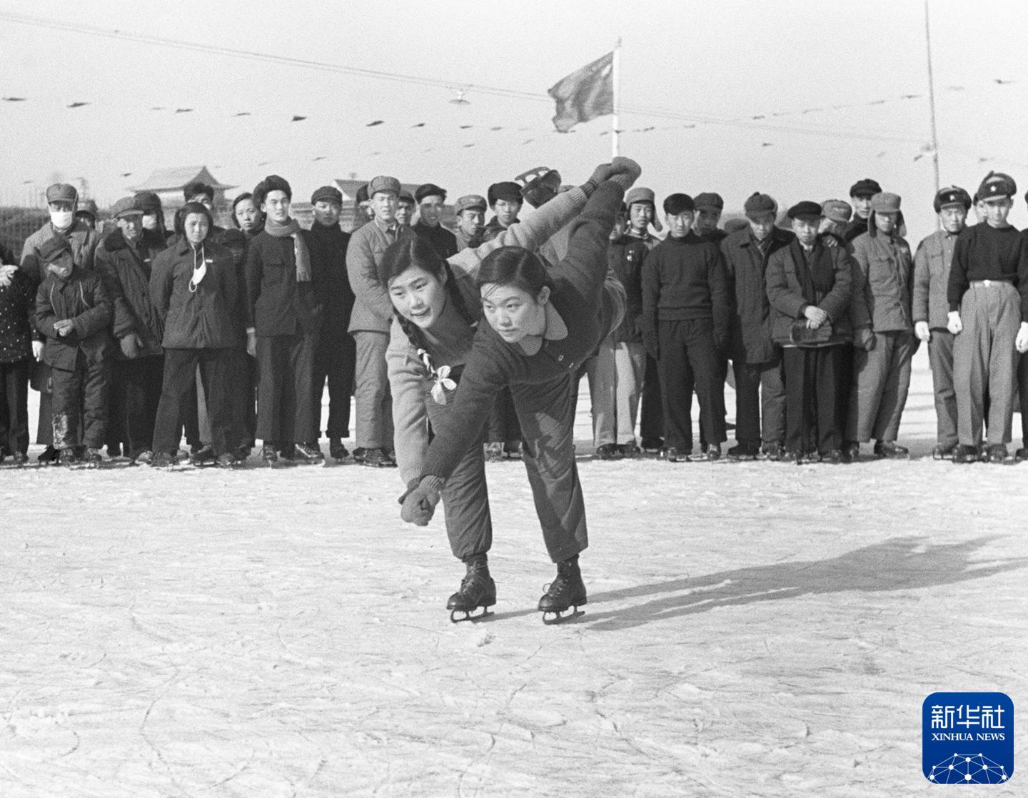 这是1955年在北海公园溜冰场拍摄的花样滑冰示范表演。新华社记者 张家骅 摄