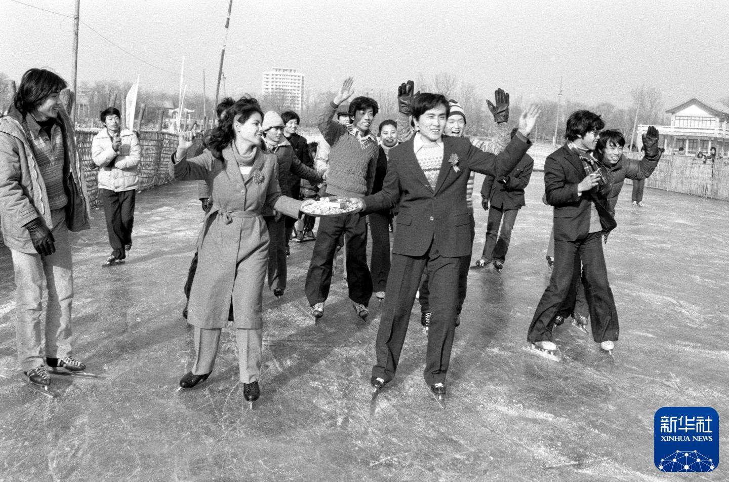 1985年1月24日,北京一对青年在紫竹院公园冰场上举行别开生面的婚礼。新华社记者 袁兆义 摄