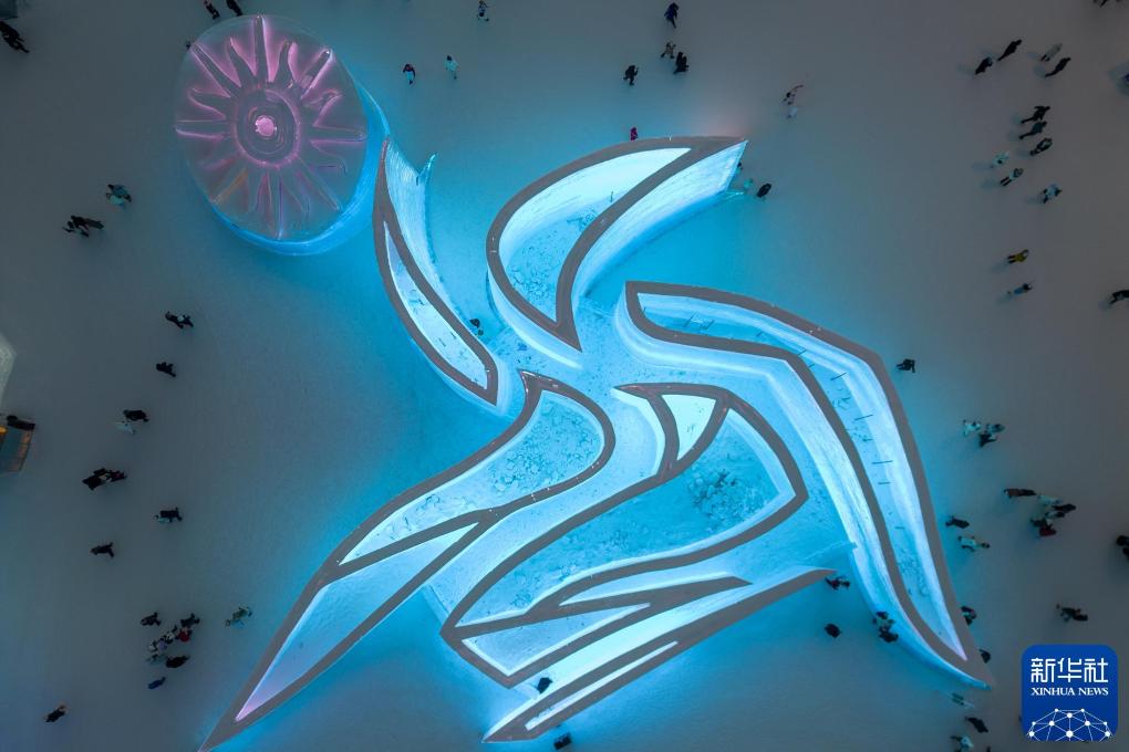 2025年1月23日拍摄的哈尔滨冰雪大世界园区内的第九届亚冬会会徽冰建景观。新华社记者 张涛 摄