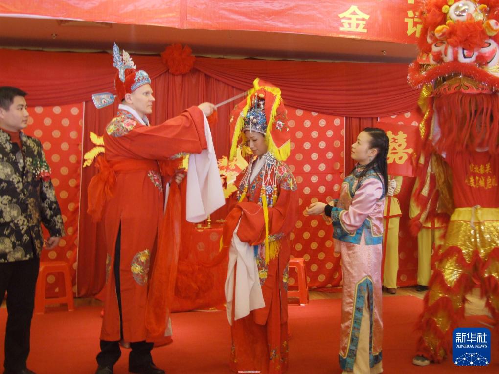 2008年春节期间,来自美国加利福尼亚的新郎卡尔,在江西龙南按中国传统风俗举行了婚礼。 新华社发(赖锦洪 摄)