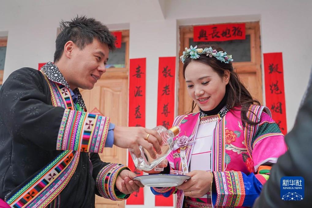 2022年春节前,在甘肃省陇南市文县铁楼藏族乡寨科桥村的白马藏族婚礼上,新娘和新郎准备向宾客敬酒。新华社记者 郎兵兵 摄