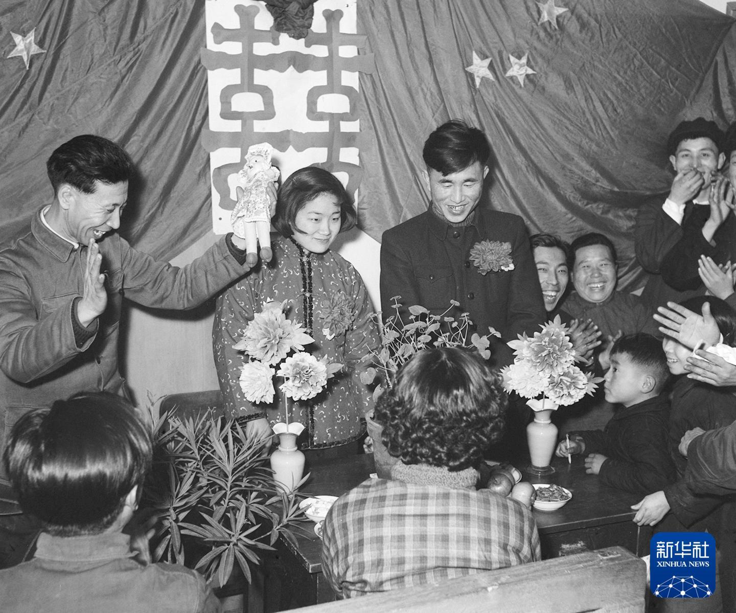 1957年春节期间,辽宁省沈阳风动工具厂的两名工人喜结连理,在婚礼上接受朋友们的祝贺。新华社记者 于肇 摄