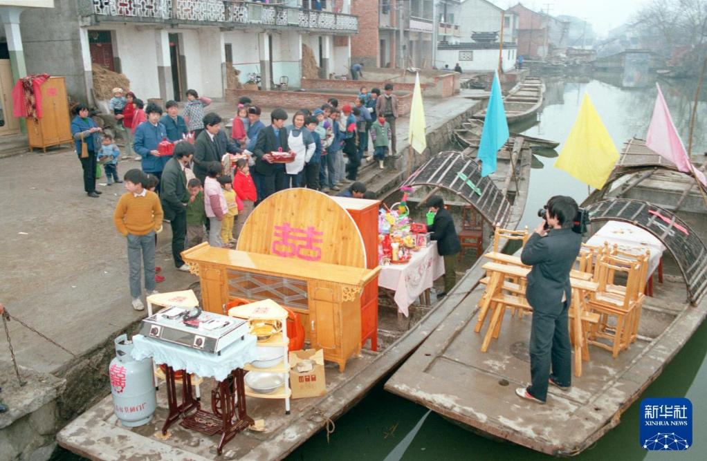 1990年春节前夕,浙江绍兴马山镇的一户人家办婚礼,迎亲用的交通工具是水乡里常见的船。新华社记者 徐邦 摄
