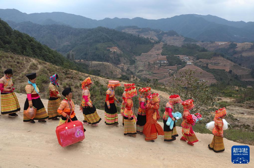 2017年2月21日,在四川省凉山彝族自治州德昌县南山傈僳族乡小南山村,新娘和送亲队伍带着嫁妆向男方家走去。每年春节前后(农历腊月至次年二月)是当地傈僳族人举行婚礼的季节。新华社记者 江宏景 摄