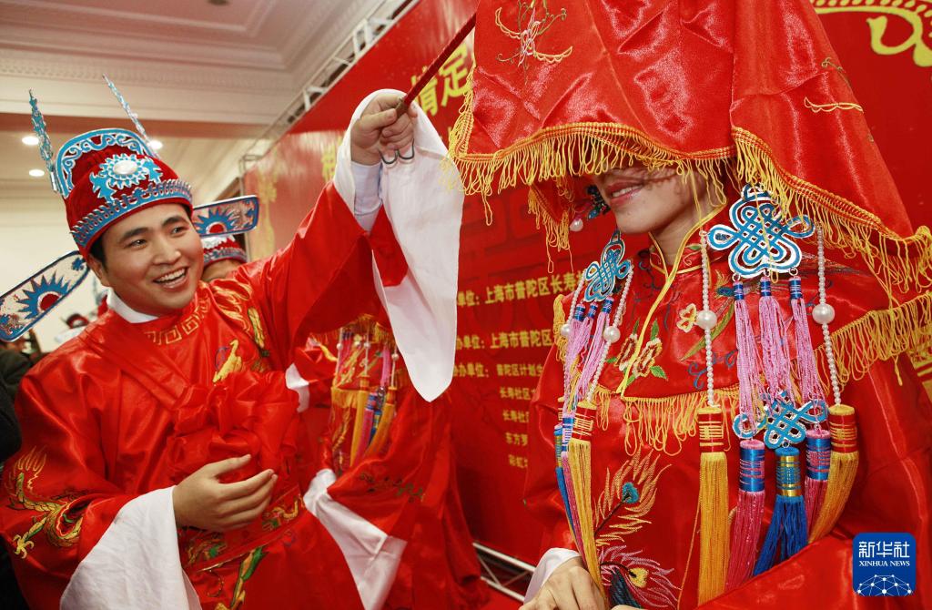 2008年春节前夕,六对因为雪灾无法回家举办婚礼的外来务工人员在上海市普陀区长寿路街道举办集体婚礼。图为一位新郎在婚礼上挑开新娘的红盖头。新华社记者 裴鑫 摄