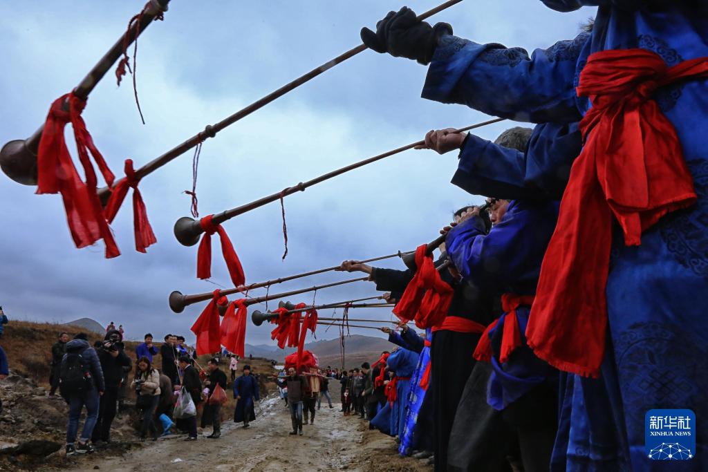 2016年春节前夕,贵州省惠水县摆榜乡石板村村民按照当地婚俗举行婚礼,接亲队伍长鸣长号迎娶新娘。新华社发(张晖 摄)