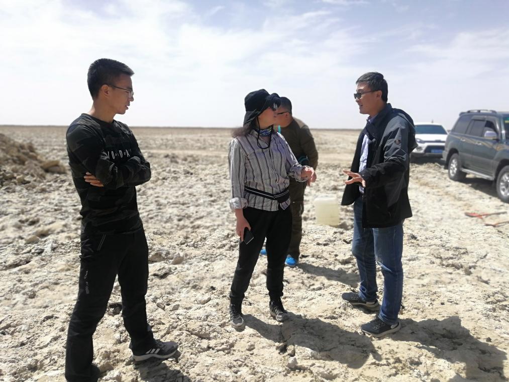 2020年5月6日,王建萍(左二)参加盐湖区雨洪增补与卤水资源绿色开发技术集成与示范区选址考察。(受访者供图)