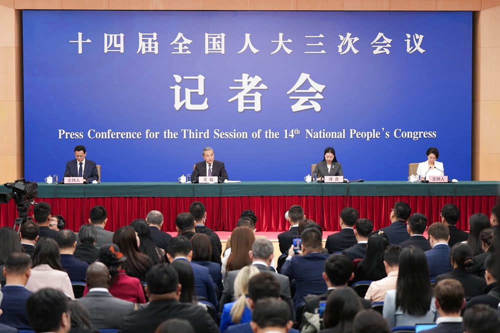 3月7日,十四届全国人大三次会议在北京梅地亚中心新闻发布厅举行记者会。中共中央政治局委员、外交部长王毅就中国外交政策和对外关系回答中外记者提问。 新华社记者 刘大伟 摄
