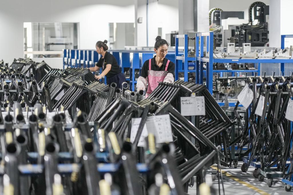 2024年7月8日,在山东泰山瑞豹复合材料有限公司生产车间,工人在加工碳纤维自行车架。新华社记者 朱峥 摄