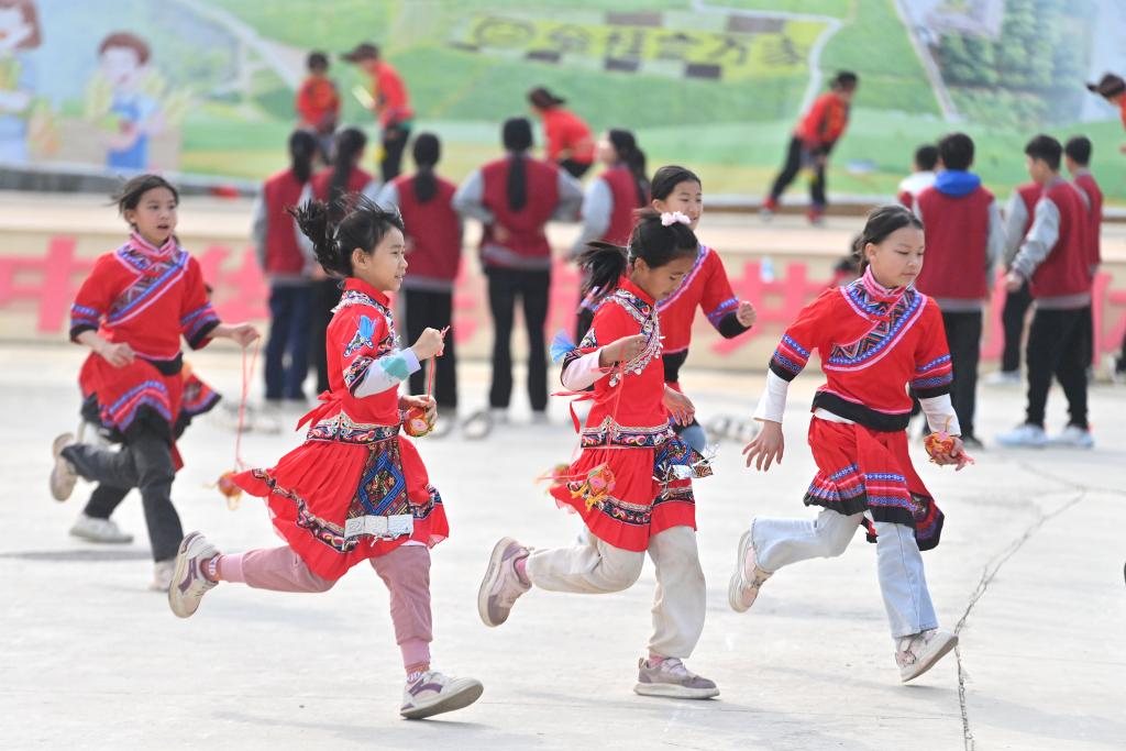 2月20日,在梧州市长洲区倒水镇富万村金桂广场,富万小学的学生准备参加抛绣球比赛。新华社记者 黄孝邦 摄