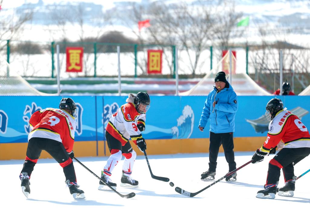 2月21日,在新疆乌鲁木齐县第一中学,学校冰球队队员在体育课上训练。新华社记者 王菲 摄