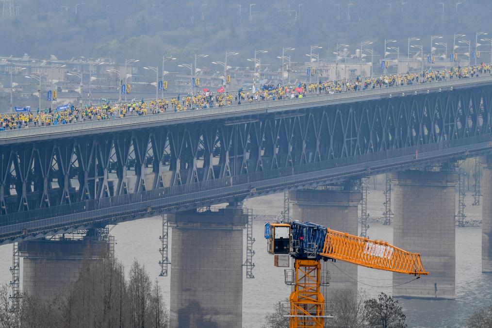 2024年3月24日,参赛选手经过武汉长江大桥。当日,2024武汉马拉松鸣枪开跑。新华社记者 杜子璇 摄