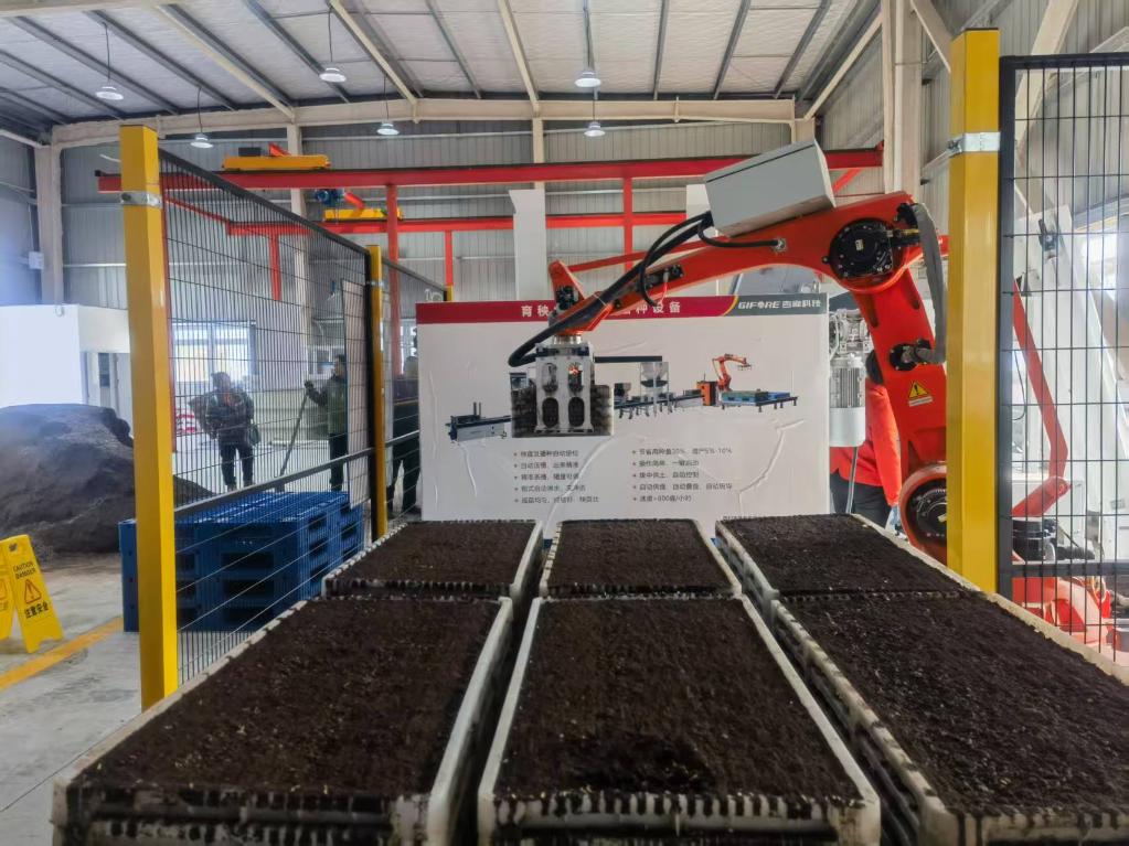 记者采访时,这个新“农服”基地的工厂化育秧车间正满负荷运转,只见一个个秧盘经过基质入盘、均匀撒种、覆土、喷淋等程序后,被整齐地送入暗化室催芽。