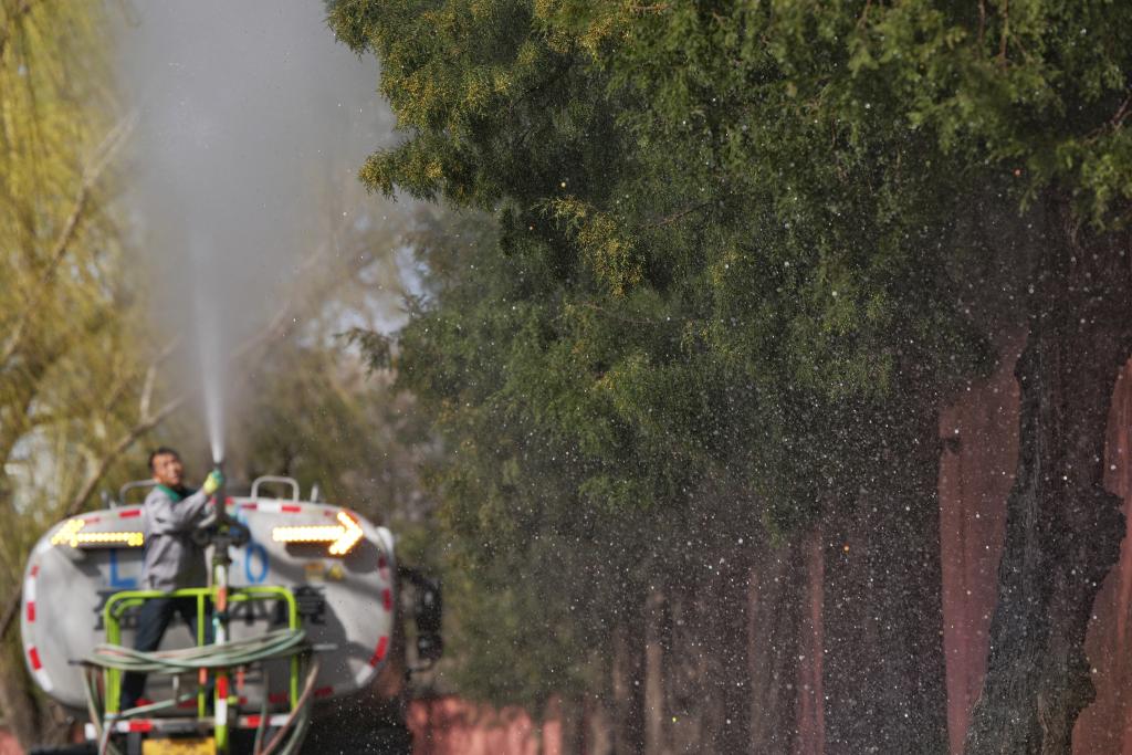 记者在位于北京东四环的红领巾公园里看到,一辆水车尾灯双闪、缓缓行进,站在车上的工作人员手持高压水枪对圆柏开展冲淋作业,花粉顺着水流不断落地。另一旁,园林工作人员对开花较多的枝条进行修剪。