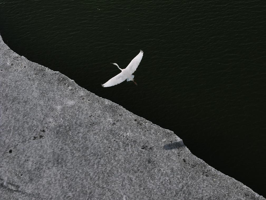 3月31日,一只白鹭飞过松花江哈尔滨段一处水域。新华社发(张树摄)