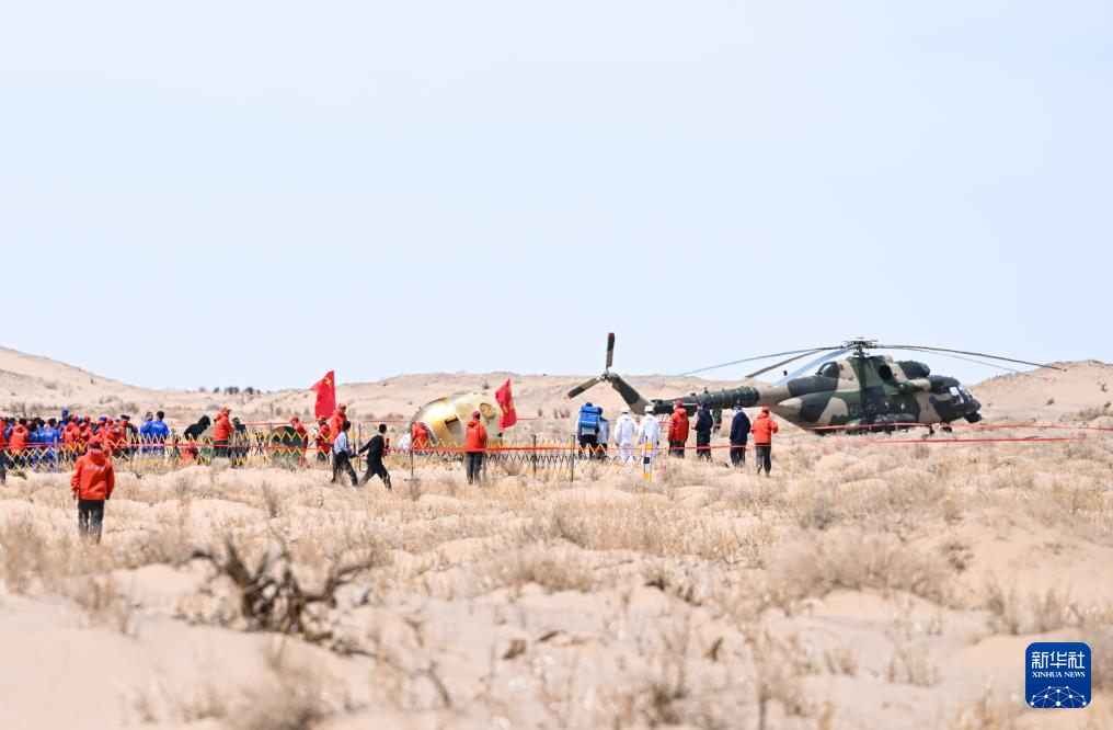 4月30日,神舟十九号载人飞船返回舱在东风着陆场成功着陆,航天员蔡旭哲、宋令东、王浩泽身体状态良好,神舟十九号载人飞行任务取得圆满成功。 新华社记者 贝赫 摄