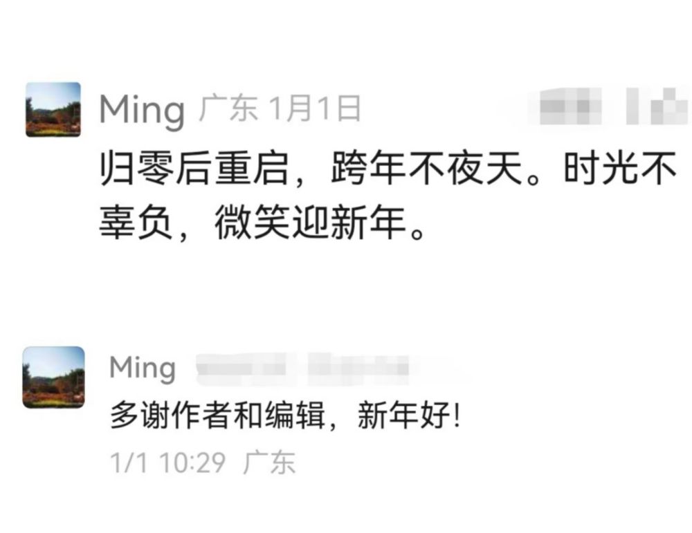 有的读者和小编是君子之交,不常评论,但每一条留言都有感而发,一看就是认认真真读完全篇,才写下的文字。有位广东读者,头像是风景照,猜不出年纪,就叫他“明兄”吧。无论新闻、暖闻还是科普文章,他总能用一两句话精准地提炼大意,有时还颇有诗意。2024年的最后一条推送,我们推荐了一些精彩的朋友圈跨年文案,这次“明兄”没有做总结,而是自己在评论区写了几句:“归零后重启,跨年不夜天。时光不辜负,微笑迎新年。”简简单单的祝福,或许不符合平仄格律,却真诚实在。我精选了“明兄”的留言,他在后台回复了一句“谢谢鼓励”。每次被小编选中,他都会像这样谦和有礼地道谢。总结起来,他的大部分留言表达的意思无非九个字:“你推的,我看了,看懂了。”在作者和编者眼里,有这九个字,也就足够了。