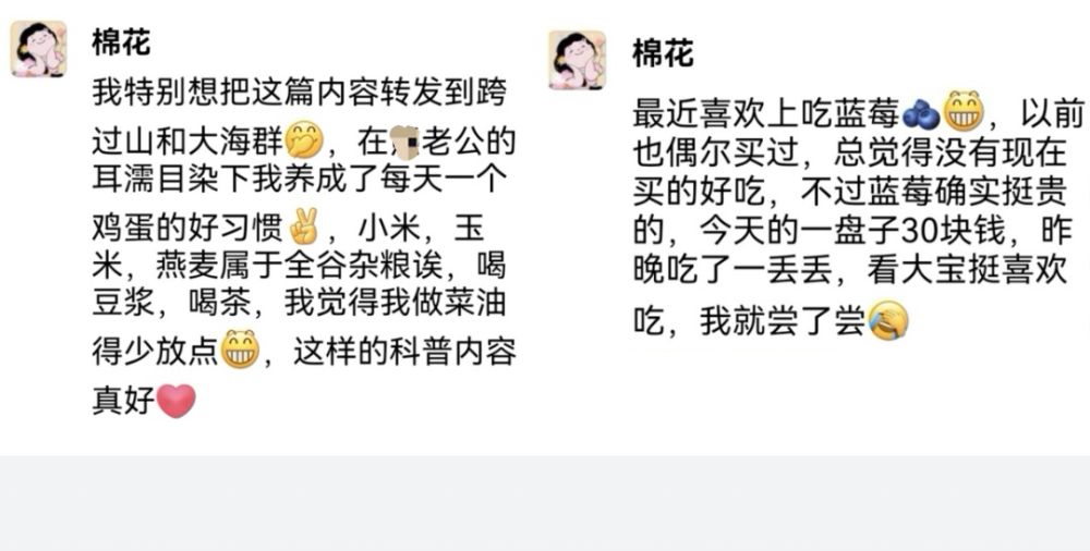 评论区里,活跃着许多“老朋友”,比如IP定位天津的“棉花”姐姐。她偏爱生活化接地气的推文,总在评论区跟我们唠家常。她和女儿都喜欢吃蓝莓,以前“莓以稀为贵”,花几十块钱买上一些,基本都留给闺女吃。如今,蓝莓从舶来品变成“云南土特产”,价格降了,她们母女终于可以敞开来吃了。