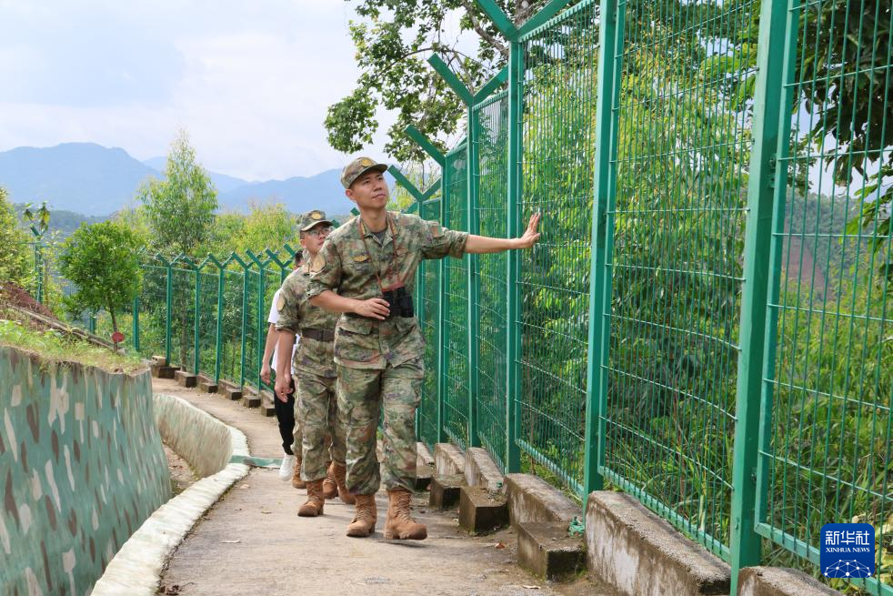广西军区某部谢亮(前一)组织军地人员巡察边境国防设施(资料照片)。 新华社发(梁凯昌摄)