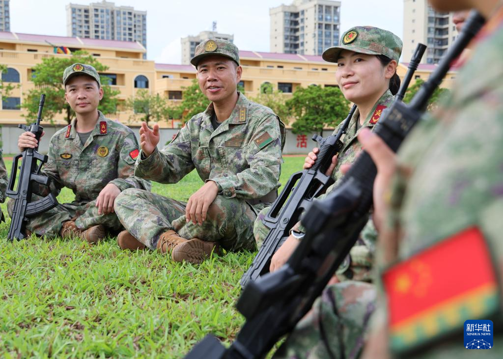 广西军区某部谢亮(左二)与参训民兵谈心交流(资料照片)。 新华社发(梁凯昌摄)