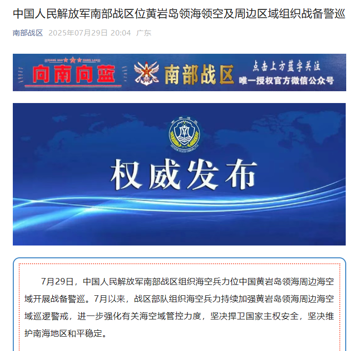 7月29日,中国人民解放军南部战区组织海空兵力位中国黄岩岛领海周边海空域开展战备警巡。7月以来,战区部队组织海空兵力持续加强黄岩岛领海周边海空域巡逻警戒,进一步强化有关海空域管控力度,坚决捍卫国家主权安全,坚决维护南海地区和平稳定。