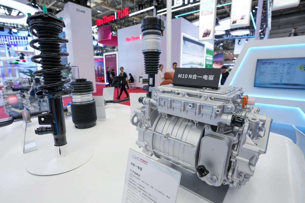 7月19日,在智能汽车链展区广汽部件展台拍摄的新能源汽车电驱和悬挂产品。新华社记者 鞠焕宗 摄