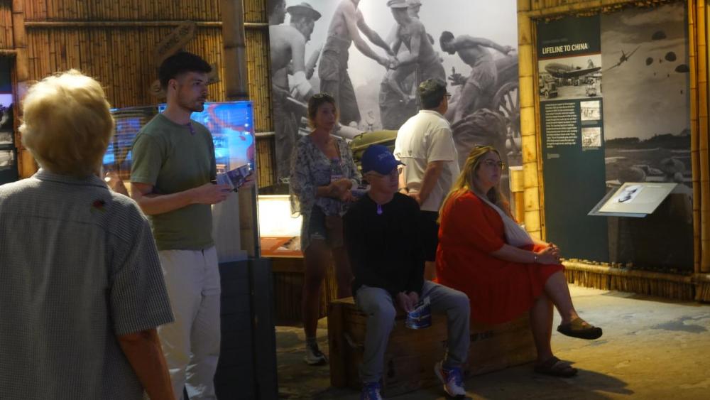 不仅如此,“通往东京之路”展览,还以多媒体方式突出展示了飞虎队和驼峰航线:天花板上悬吊着一架修复后的飞虎队P-40战鹰战斗机,机头绘着鲨鱼嘴,而馆方独具匠心的设计,让参观者在仰望战机时,恰巧能看到其下巨大的三联电子屏幕上,一架C-47运输机在鲨鱼嘴下飞越喜马拉雅雪山。展厅说明中写道,中缅印战区迫使日军在亚太战争的第二条战线上作战,具有至关重要的战略意义——11个日军师团在岛屿和海上与美军作战时,还有多达40个师团(近100万日军)被困在中国的中日战争中。
