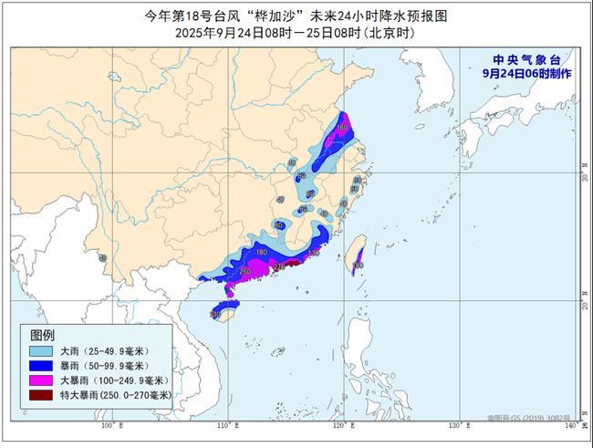 降水预报:24日08时至25日08时,广东大部、广西东部和南部、福建东部和南部、海南岛北部和西部、台湾岛东部、江苏中部、安徽中南部、湖北东部、江西北部、东部和西南部、浙江东部等地部分地区有大到暴雨,其中,广东中南部、福建东南部、海南岛西部、台湾岛东南部、江苏中部、安徽中部等地部分地区有大暴雨,广东东南部沿海和西部等地局地特大暴雨(250~270毫米)。