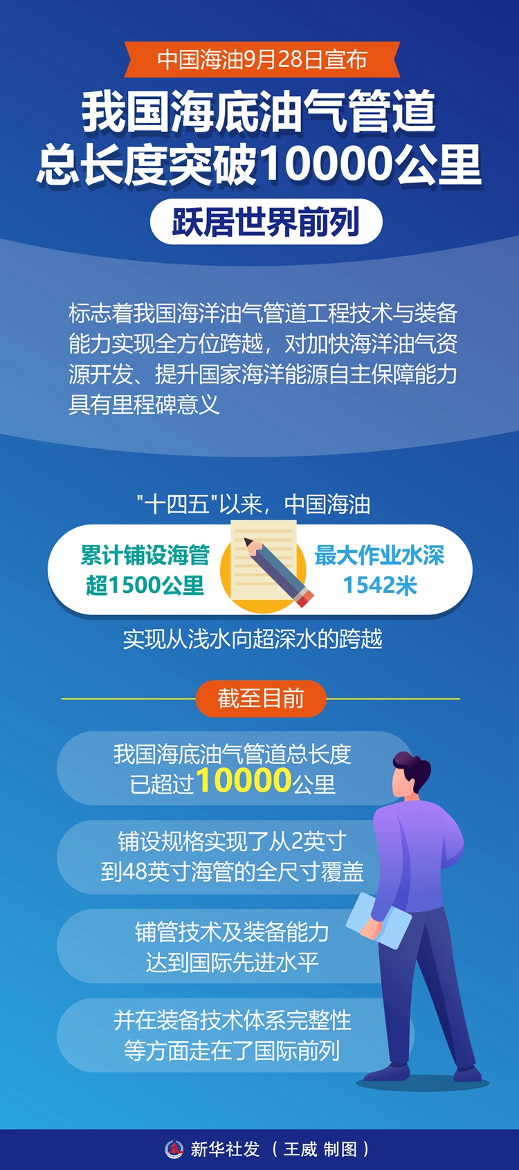 新华社北京9月28日电(记者王悦阳、梁姊)中国海油28日宣布,我国海底油气管道总长度突破10000公里,跃居世界前列,标志着我国海洋油气管道工程技术与装备能力实现全方位跨越,对加快海洋油气资源开发、提升国家海洋能源自主保障能力具有里程碑意义。