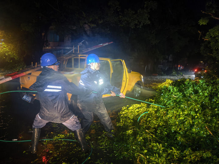 台风过境后,供电部门随即开展线路巡视,清理路面掉落导线。新华网发(吕洁敏 摄)