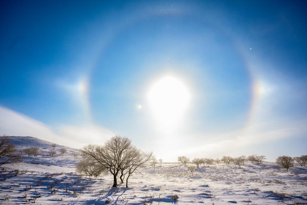在西乌珠穆沁旗草原上拍摄的日晕景观。寒冬时节,内蒙古锡林郭勒盟西乌珠穆沁旗的草原白雪皑皑、银装素裹,呈现出独特的冬日美景。新华社记者 彭源 摄