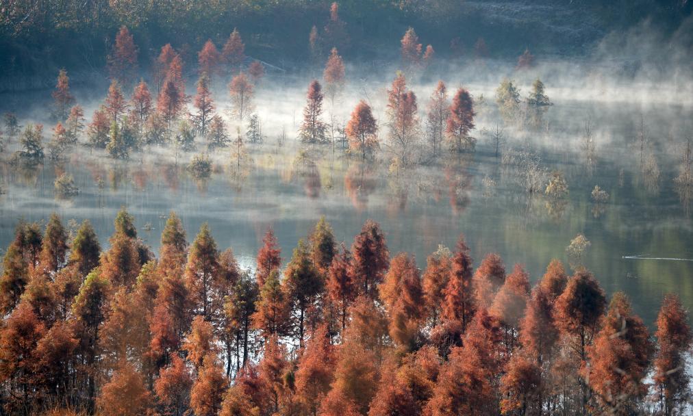 水鸟游过清晨薄雾中的甸尾村水杉湿地。冬日清晨,昆明市盘龙区滇源街道甸尾村水杉湿地笼罩在一片飘渺水雾中,宛如仙境。新华社记者 秦晴 摄