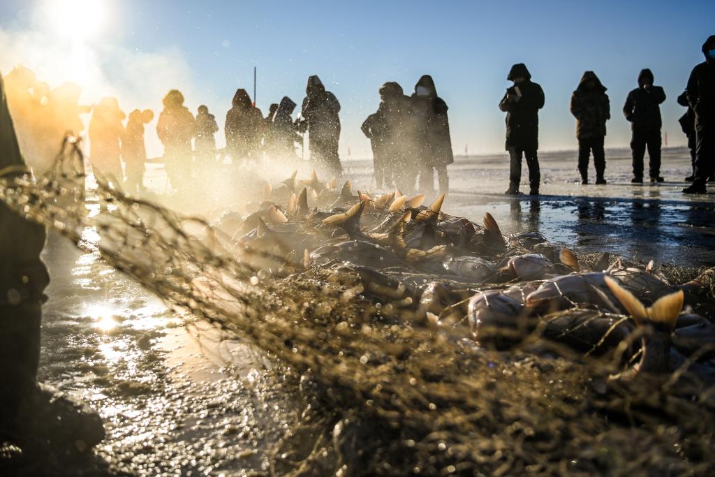 游客在查干湖冰面上近距离观看冬捕盛况。查干湖位于中国吉林省松原市前郭尔罗斯蒙古族自治县,渔产资源丰富,被誉为“中国北方最后的渔猎部落”。每年12月末,在查干湖冰封湖面上,渔民先用冰锥在湖面上凿出几百个冰洞,然后利用穿针引线的原理将几千米长的渔网按照冰洞间的连线形成合围,再用马拉绞盘收网捕鱼,查干湖冬捕奇观已列入中国国家级非物质文化遗产。 新华社记者 颜麟蕴 摄