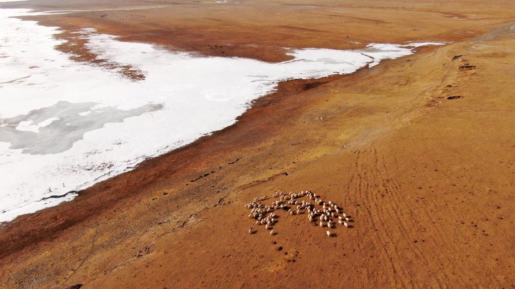 太阳露出地平线,羊群在冰面上投下纤长的蓝色影子。每年高原最冷的时刻,有“仙女眼泪”之称的普莫雍错封冻成冰湖,牧人们迎来最佳的羊群转场时机。这种转场牧业方式,在这片离天最近的地方已延续了上千年。新华社记者 普布扎西 摄