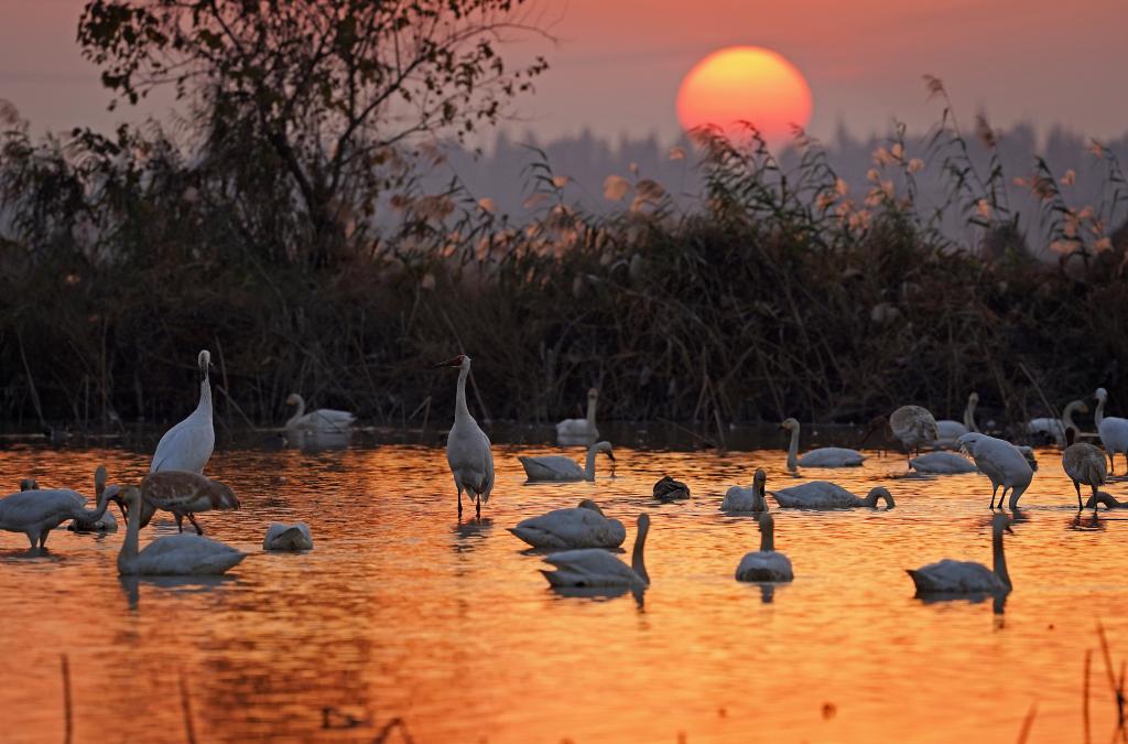 冬日清晨,在山东省荣成市成山镇天鹅湖,大天鹅在晨曦中游弋、漫步、觅食,构成一幅和谐的生态画卷。新华社发(李信君 摄)