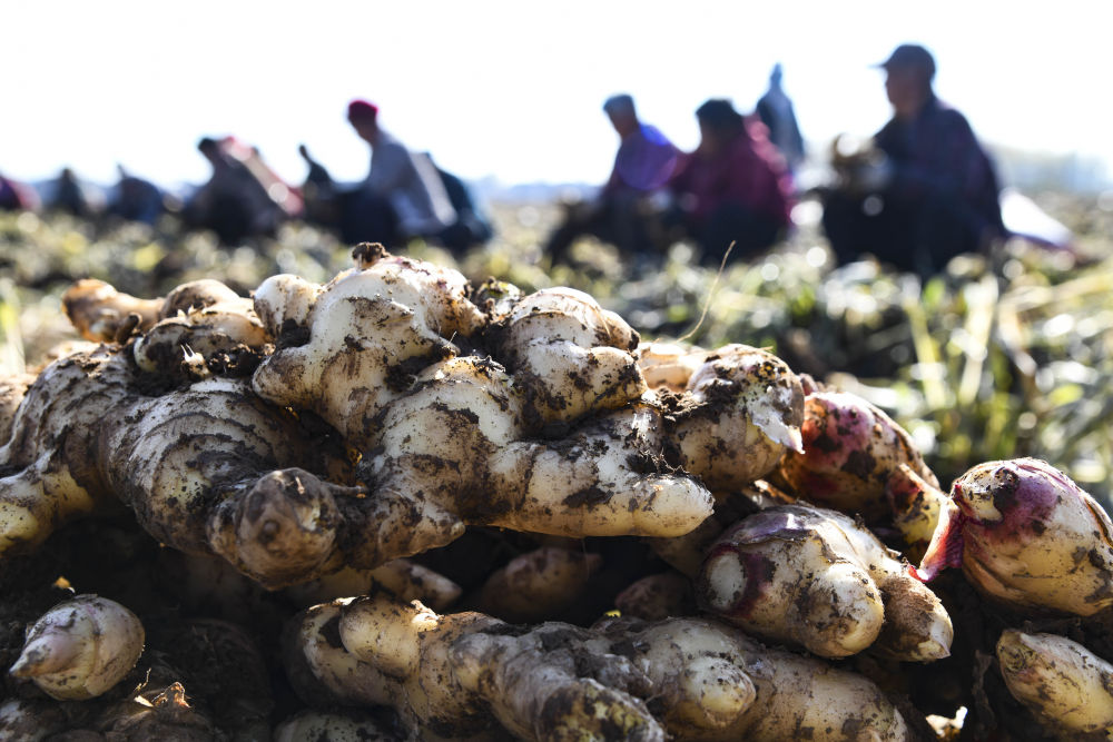 11月21日,河南省济源市克井镇农民在田间收获生姜。新华社发(苗秋闹 摄)