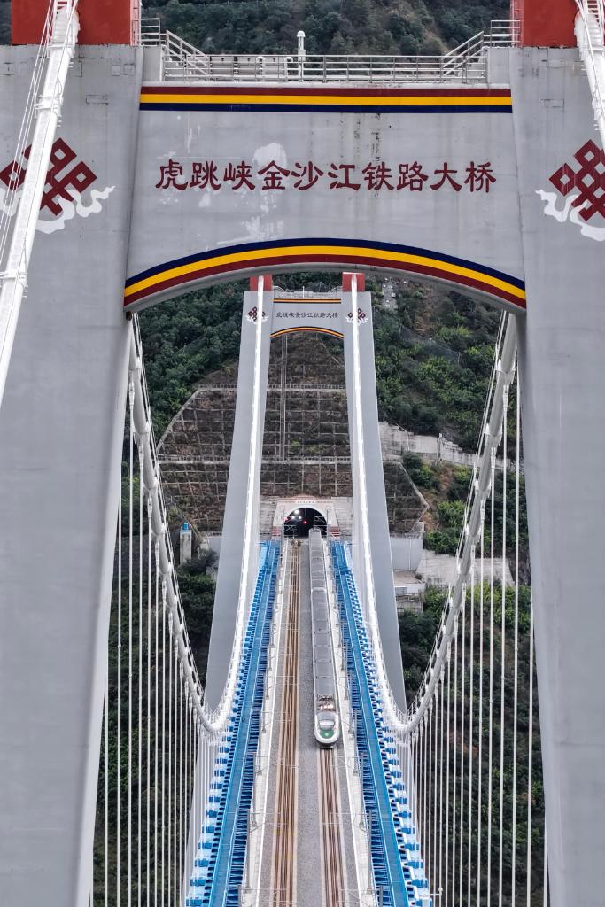 11月21日,动车组列车通过虎跳峡金沙江铁路大桥(无人机照片)。