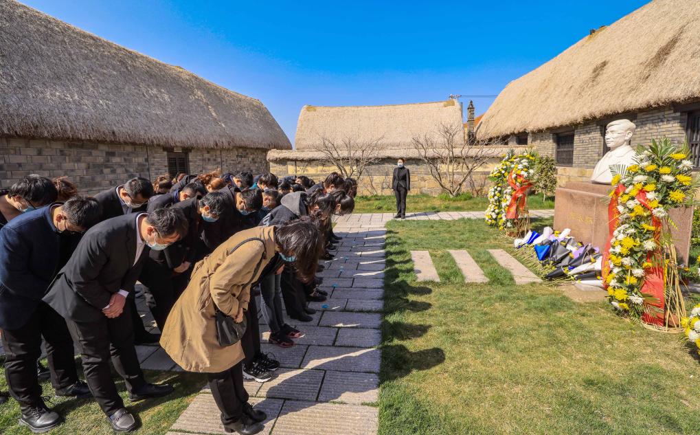 2021年4月4日,在山东荣成滕家镇郭永怀故居,人们向郭永怀雕像鞠躬。新华社发(李信君 摄)
