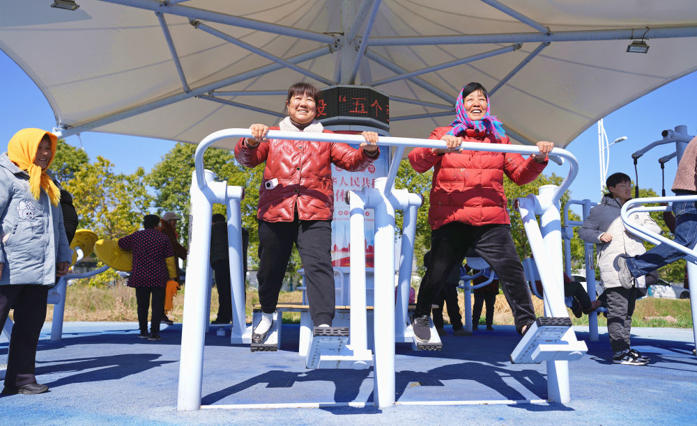 ↑3月19日,在江苏省海安市墩头镇墩头村,村民在家门口的一处“口袋公园”里使用健身器材锻练身体。