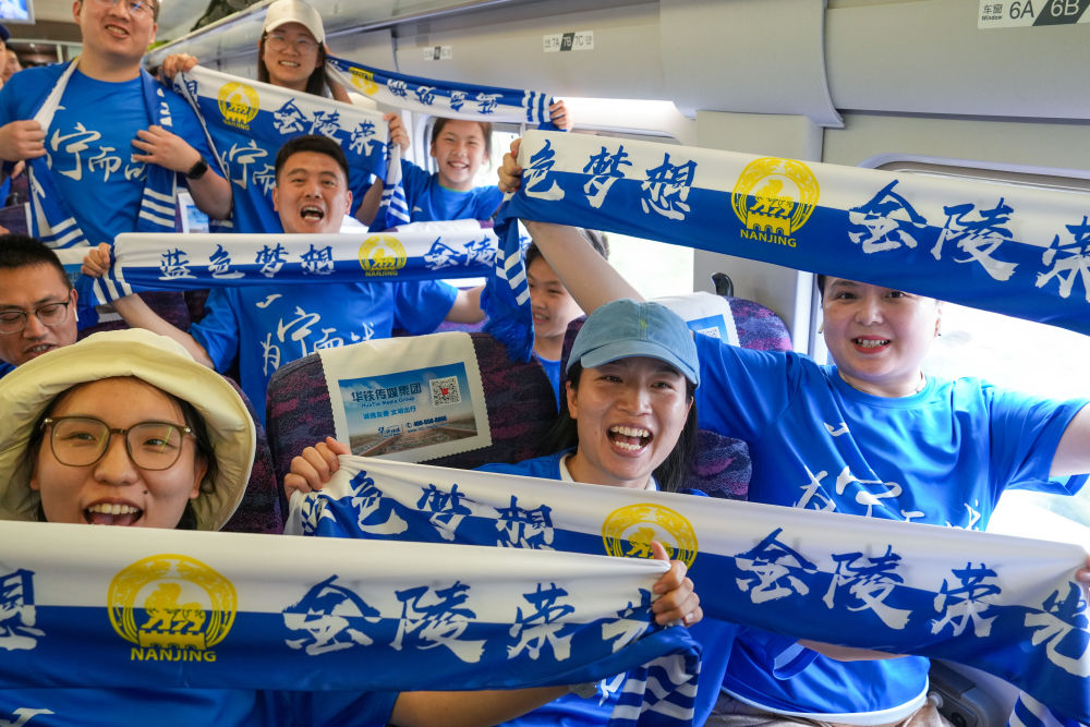 ↑6月14日,球迷乘坐在G9253次“苏超”球迷高铁专列前往淮安,观看“苏超”第四轮淮安队对阵南京队的比赛。