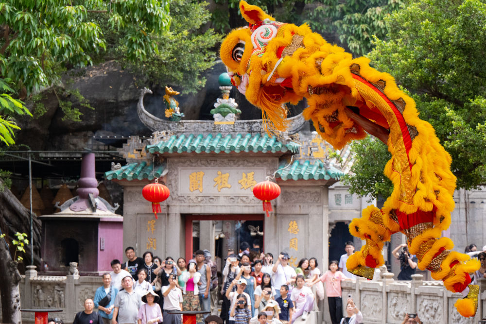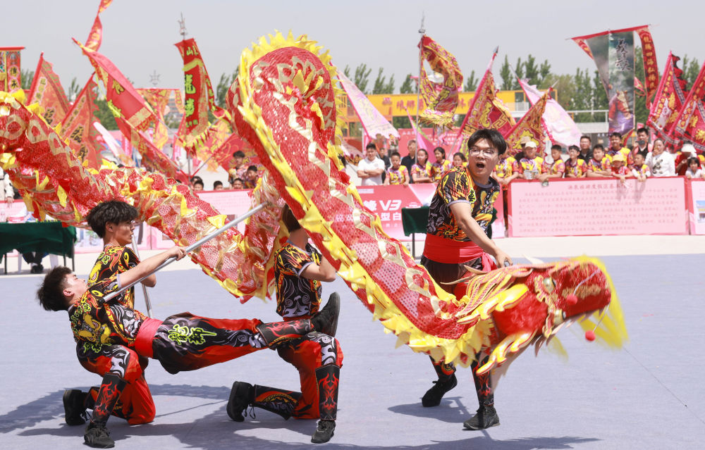↑4月26日,在2025年山东省第五届舞龙舞狮锦标赛暨山东省第十五届全民健身运动会舞龙舞狮比赛现场,参赛舞龙队在比赛中。